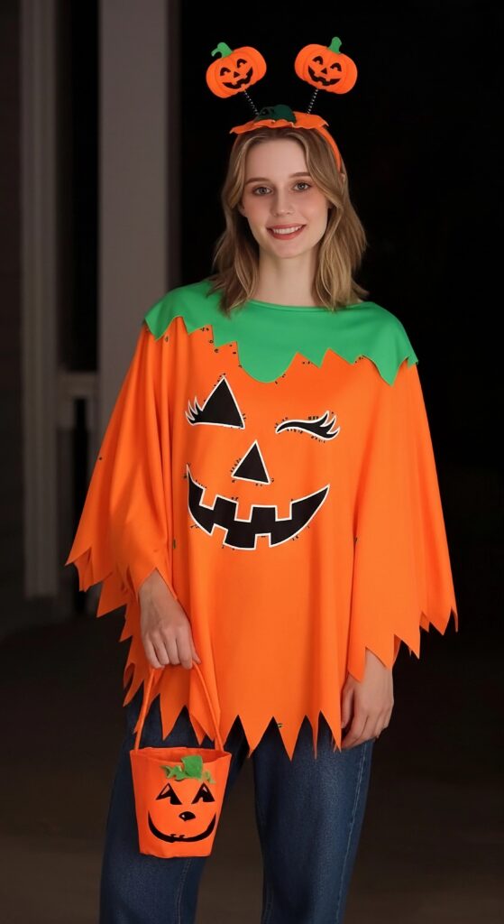 • 3-Piece Set: It comes complete with the main Pumpkin Poncho, a matching Headband, and a functional Pumpkin Bag for carrying your essentials (or treats!).